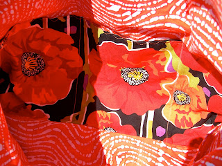 I finally made time to make myself a diaper bag this week - seems silly but there was always someone else's bag to make so I put it off for weeks, then months. :) Well, the waiting paid off because I am super thrilled with how my bag turned out. I found some great material a few months back at my favorite quilting store in Anacortes - it has a black background with these large, gorgeous poppies on it... oranges, white, yellow, amber, red - all represented. It jumped out at me as I walked by and begged me to buy it! I did with no project in mind; just knew I had to have it! Not long after I came across a ton of great tye-die print fabric in a variety of colors at Wal-Mart... they were on sale and I knew it'd be easy to find pairings for them. That's where the great orange-red coordinating fabric came from. Here's the finished result: