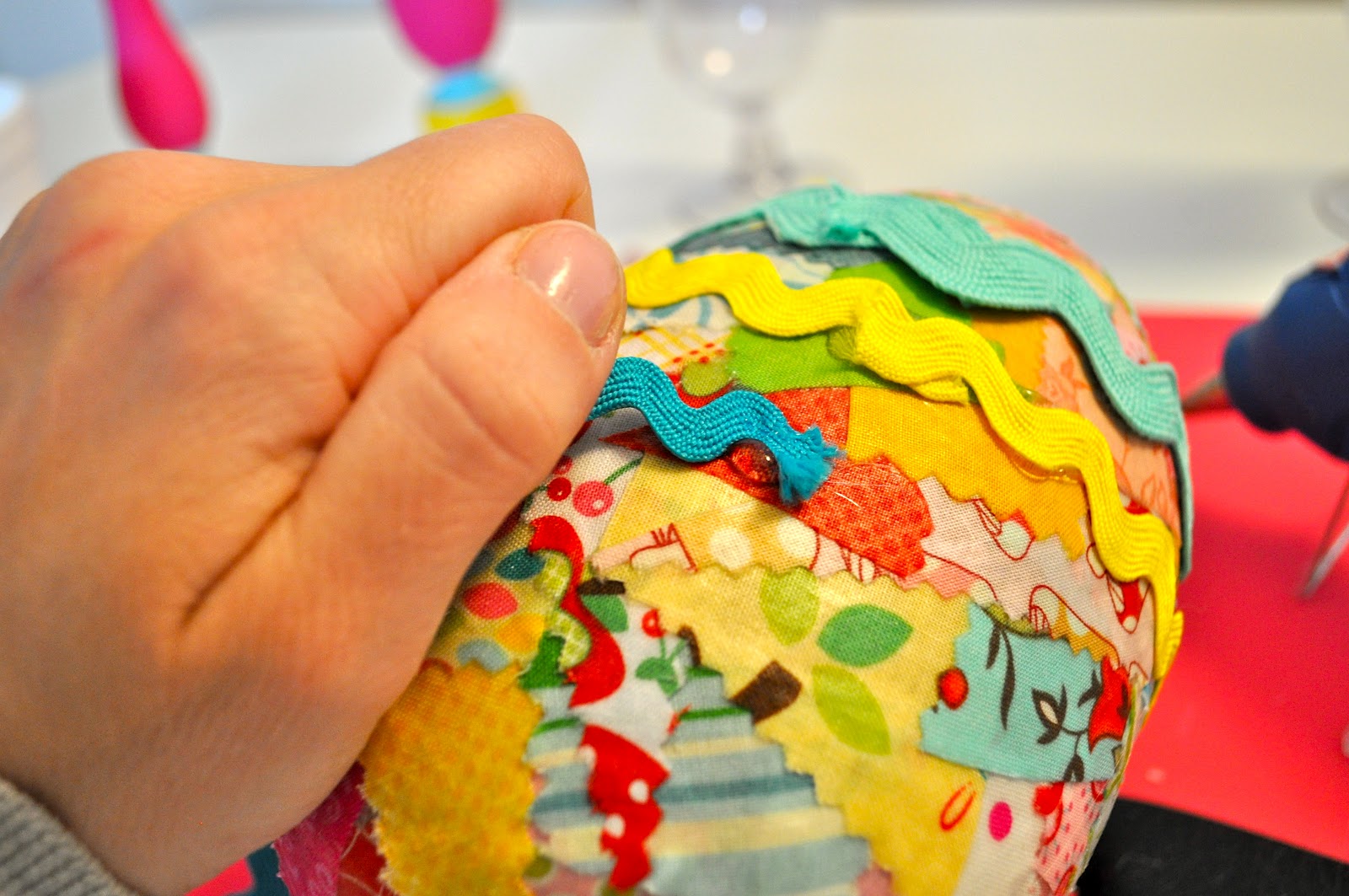 Coat a good sized area of the egg with Mod Podge, then adhere a scrap of fabric
